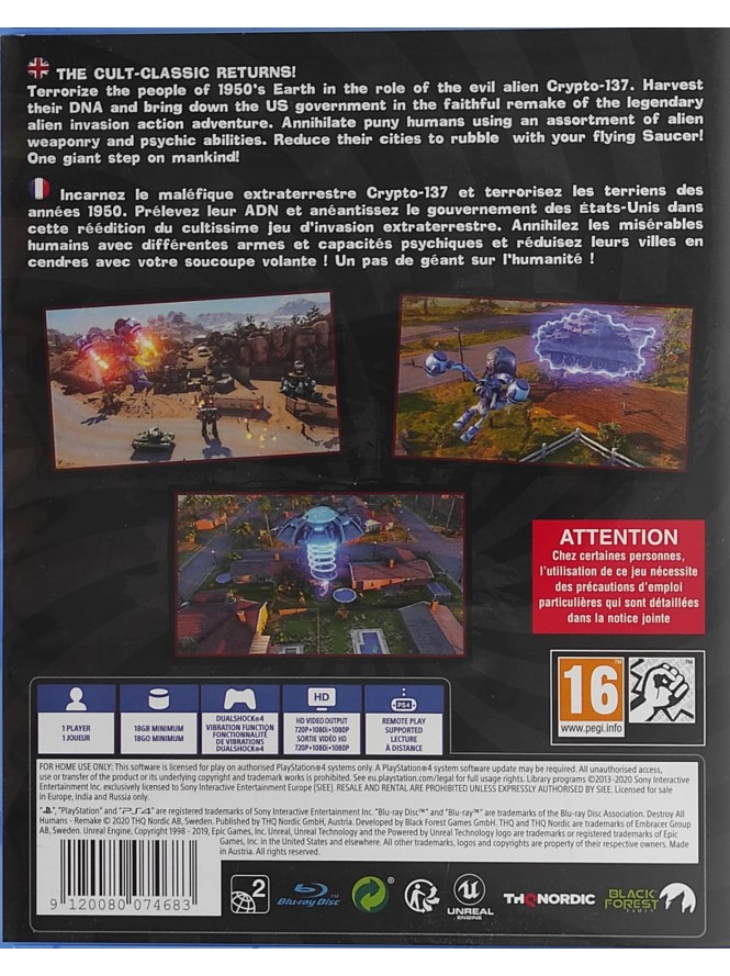 Clasicul de cult revine într-un remake complet, refăcut de la zero pentru a arăta spectaculos pe PlayStation 4! Disponibil acum în variantă second-hand la Forgames.ro, Destroy All Humans! te pune în pielea lui Crypto-137, cel mai nesuferit și carismatic extraterestru din galaxie. Misiunea ta? Să invadezi Pământul anilor '50, să extragi creierele pământenilor și să semeni haos într-o parodie savuroasă a filmelor SF de epocă.