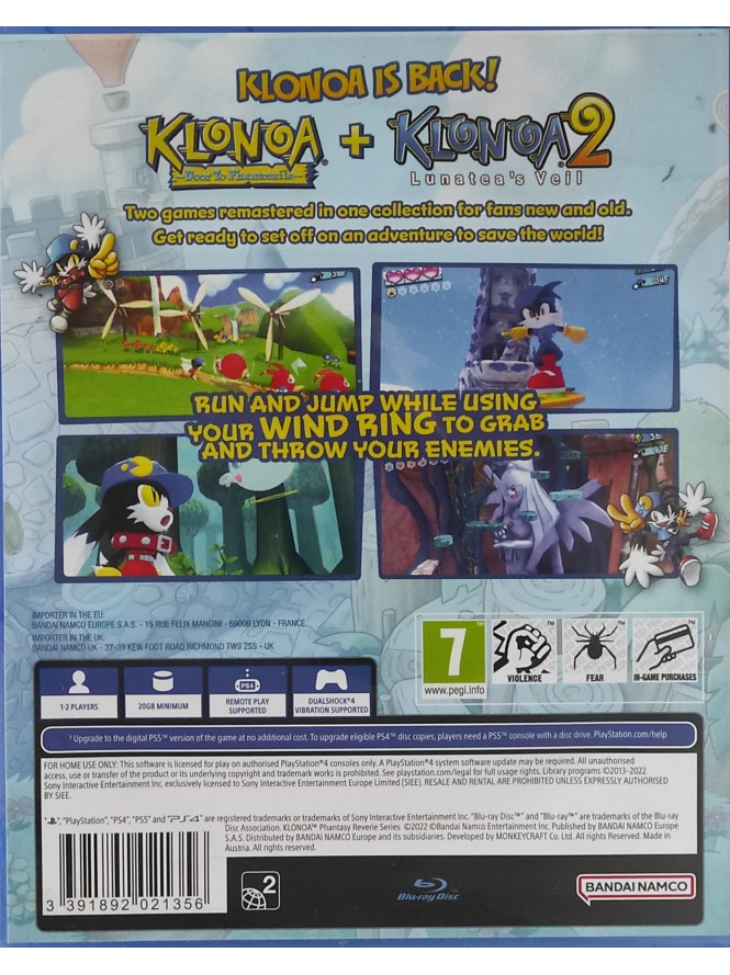 Sărbătorește a 25-a aniversare a unei serii iconice cu Klonoa Phantasy Reverie Series! Această colecție specială aduce împreună, într-un format remasterizat spectaculos, două titluri clasice care au definit genul: Klonoa: Door to Phantomile și Klonoa 2: Lunatea's Veil. Pregătește-te să pornești într-o călătorie emoționantă pentru a salva lumea viselor, alături de simpaticul erou Klonoa și "Inelul său de Vânt".