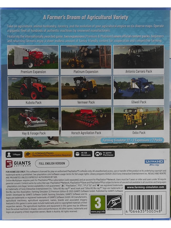Această ediție a Farming Simulator 22 conține, de asemenea, următoarele pachete: Antonio Carraro Pack, Kubota Pack, Vermeer Pack, Göweil Pack, Hay & Forage Pack, precum și două pachete care nu au fost încă anunțate.