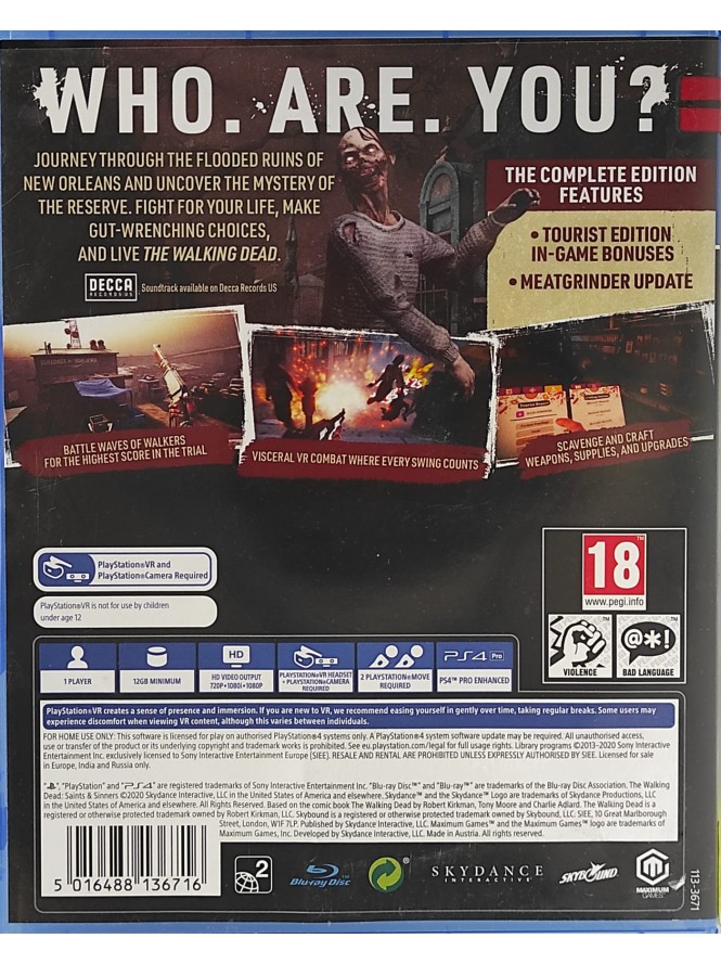 Ediția include: jocul complet The Walking Dead: Saints & Sinners PSVR, bonusuri de ediție turistică și actualizarea Meatgrinder