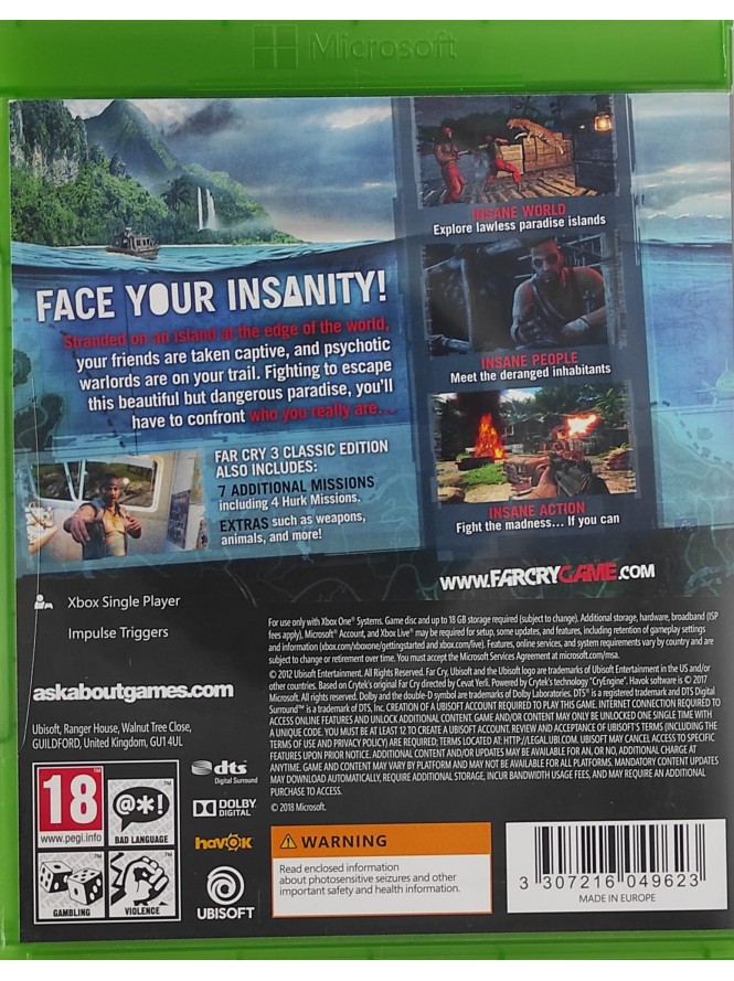 Departe de limitele civizilizaţiei se află o insulă, un loc lipsit de legi, condus de violenţă şi suferinţă, din care singura scăpare este prin intermediul drogurilor sau prin gura unei arme de foc. Acesta este locul în care te afli, captiv într-o locaţie care a uitat noţiunea binelui şi a răului, o locaţie în care trebuie să supravieţuieşti folosind pricnciiple violenţei. Far Cry 3 Classic Edition aduce Rook Island pe consolele de nouă generaţie pentru prima dată. Descoperă secretele sângeroase ale insulei şi du o luptă acerbă împotriva inamicilor; improvizează şi foloseşte mediul în avantajul tău; învinge-i pe localnicii lipsiţi de scrupule şi alienaţi mintal pentru a-ţi salva prietenii. Fii atent la frumuseţea şi misterioul care învăluie această insulă a nebuniei... vei avea nevoie de mai mult decât noroc pentru a scăpa cu viaţă. Grafică şi gameplay reactulizate Far Cry 3 Classic Edition a fost reactualizat pentru a rula pe consolele moderne şi le permite atât fanilor cât şi celor nou veniţi să experimenteze campania single-player din Far Cry 3 la detalii excelente. Descoperă o poveste memorabilă şi personaje demente Fă cunoştinţă cu serie de personaje diverse şi realiste, inclusiv unul dintre cei mai notorii infractori Far Cry: Vaas Montenegro. Cufundă-te în aceasta poveste complexă în care moralitatea este pusă sub semnul întrebării, iar speranţa nu poate fi abandonată. Luptă-te într-un shooter plin de acţiune Foloseşte arsenalul compus din arme şi explozibili pentru a te arunca în luptă, pentru a elimina inamicii din apropiere cu ajutorul cuţitului sau pentru a-i elimina de la distanţă cu ajutorul puştilor cu lunetă. O insulă a pericolului şi discoperirilor Explorează o insulă pe cât de frumoasă pe atât de diversă – de la lanţuri muntoase şi până la câmpii mlăştinoase şi plaje cu nisip auriu. Croieşte-ţi calea prin oraşele, templele, porturile fluviale şi altele.
