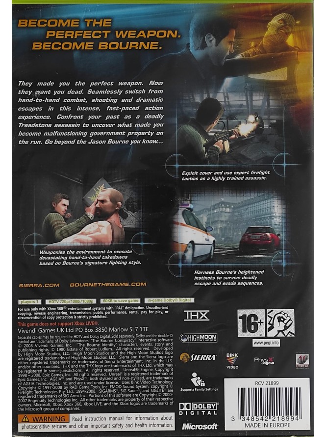Te-ai întrebat vreodată cum este să fii cel mai periculos agent secret din lume? The Bourne Conspiracy pe Xbox 360 te transpune direct în universul creat de Robert Ludlum, oferindu-ți o experiență care îmbină perfect momentele iconice din filmul „The Bourne Identity” cu misiuni originale ce dezvăluie trecutul întunecat al lui Jason Bourne.