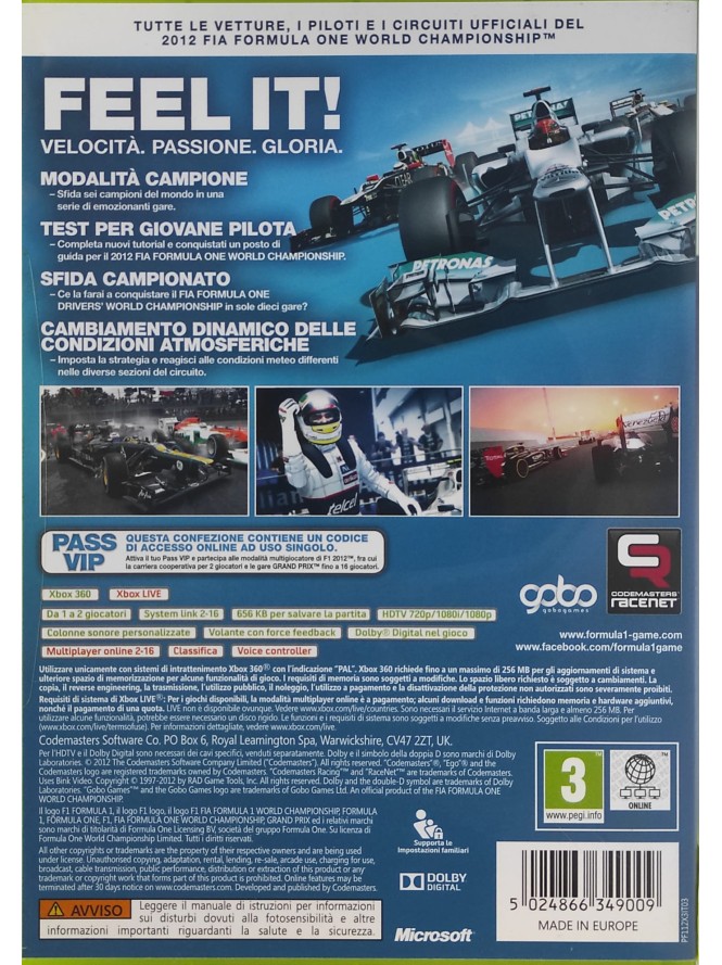F1 2012 pentru Xbox 360 – Bucură-te de experiența completă a curselor de Formula 1, cu grafică realistă, moduri de carieră și provocări palpitante.