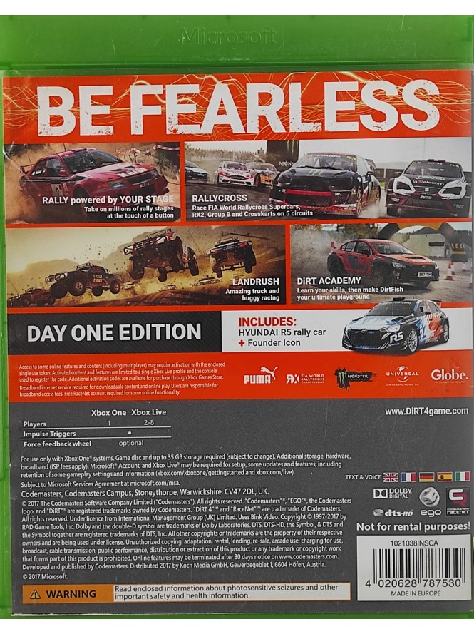 DiRT 4 vă provoacă să fii "Fearless" prin captarea emoției, emoției și pasiunii de curse off-road. Ea recreează amestecul îngrozitor de adrenalină și frică care vine de la alimentarea în jurul o curbă orb și de graba pe care o simți mergi pentru un ultim șanț de a depăși atunci când nu este suficient spațiu în ultima tură a unei curse. Cursele off-road sunt mai mult decît curbe perfecte, este vorba despre o inimă înfricoșătoare, de luare a deciziilor în cadrul secțiunilor divizate, în care vitejia aduce recompense. Peste 50 de vehicule off-road - incluzând Ford Fiesta R5, Mitsubishi Lancer Evolution VI, Subaru WRX STI NR4 și Audi Sport quattro S1 E2. Jocul oficial al Campionatului Mondial de Raliuri de la FIA - Cursa la Montalegre, Lohéac Bretagne, Hell, Holjes & Lydden Hill într-o multitudine de serii diferite.