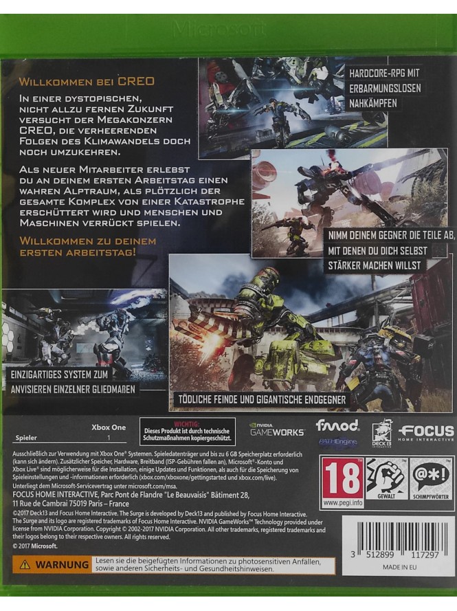 The Surge prezintă o mecanică de luptă inovatoare și un sistem original de progresie a personajului bazat pe upgrade-uri modulare obținute prin lupte strânse și viscerale.